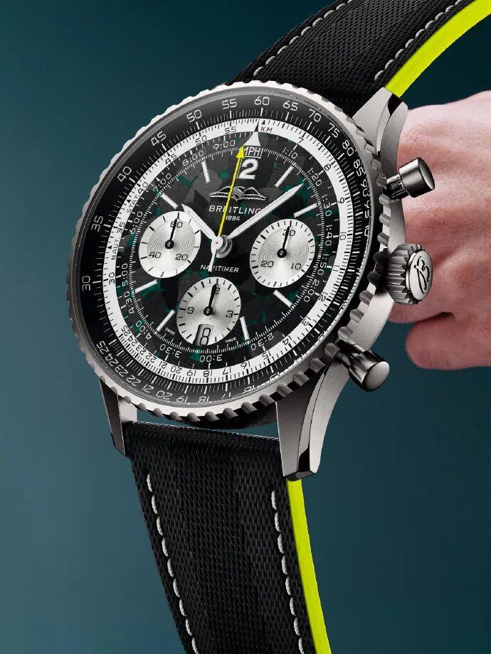 它几乎可以看作这次合作最浓缩、最直接的一次表达,百年灵把自己对时间的理解,和阿斯顿·马丁及 Aston Martin Aramco Formula One™ Team 的赛道语言,统统装进了这只43毫米的腕表里。